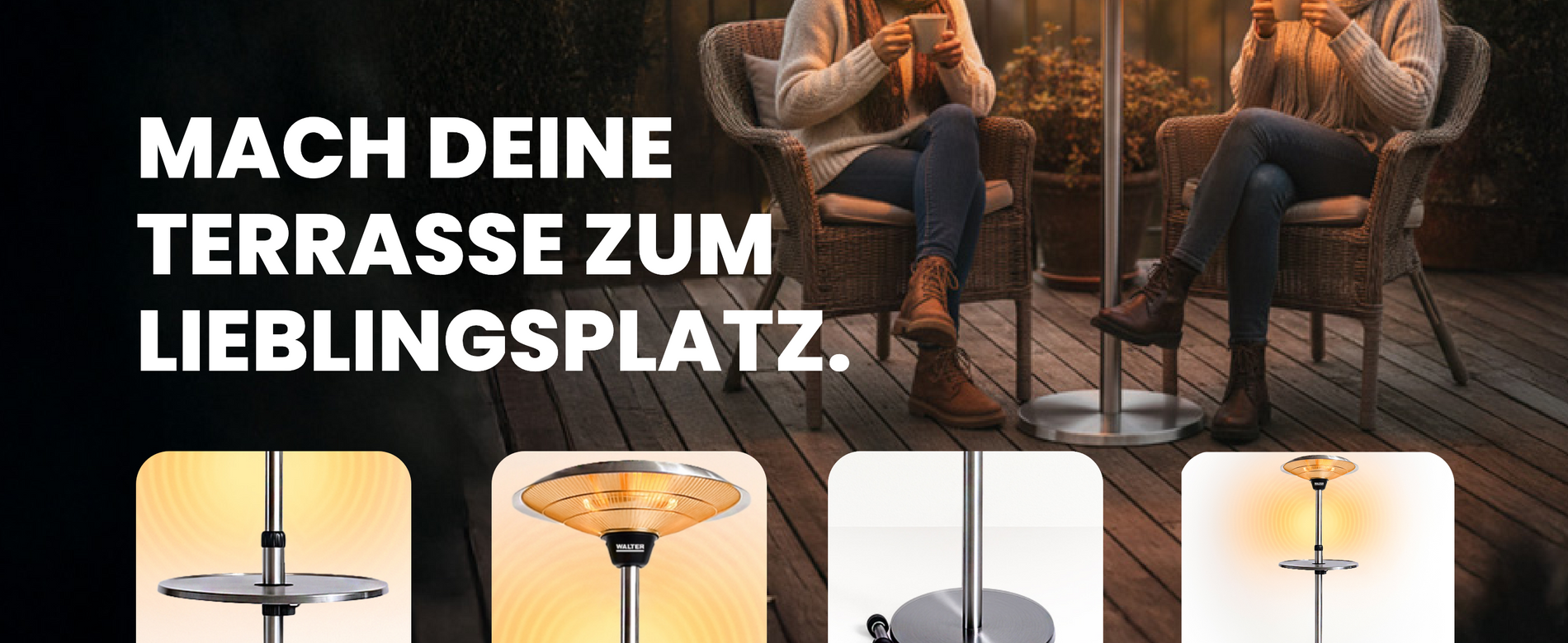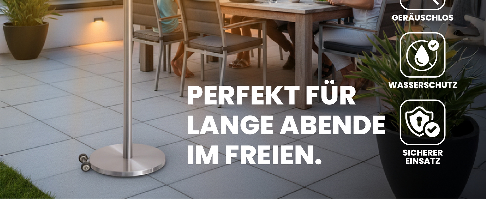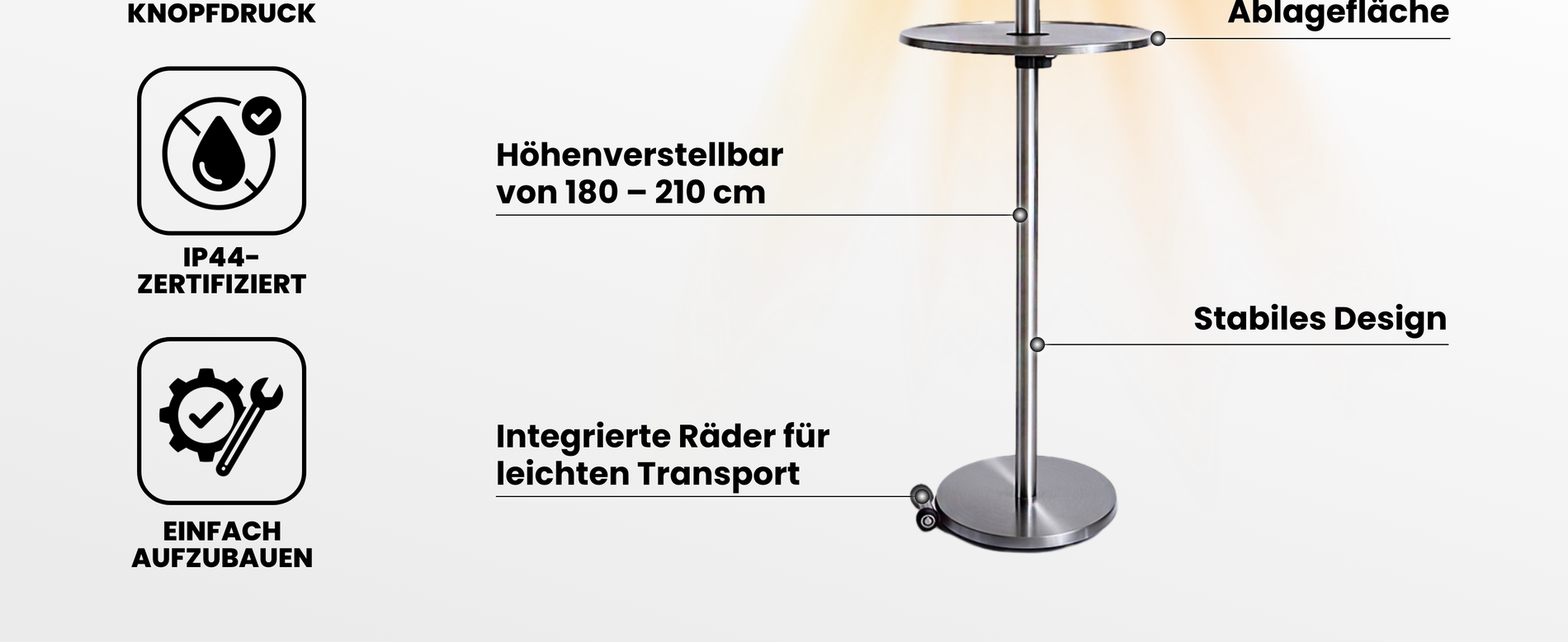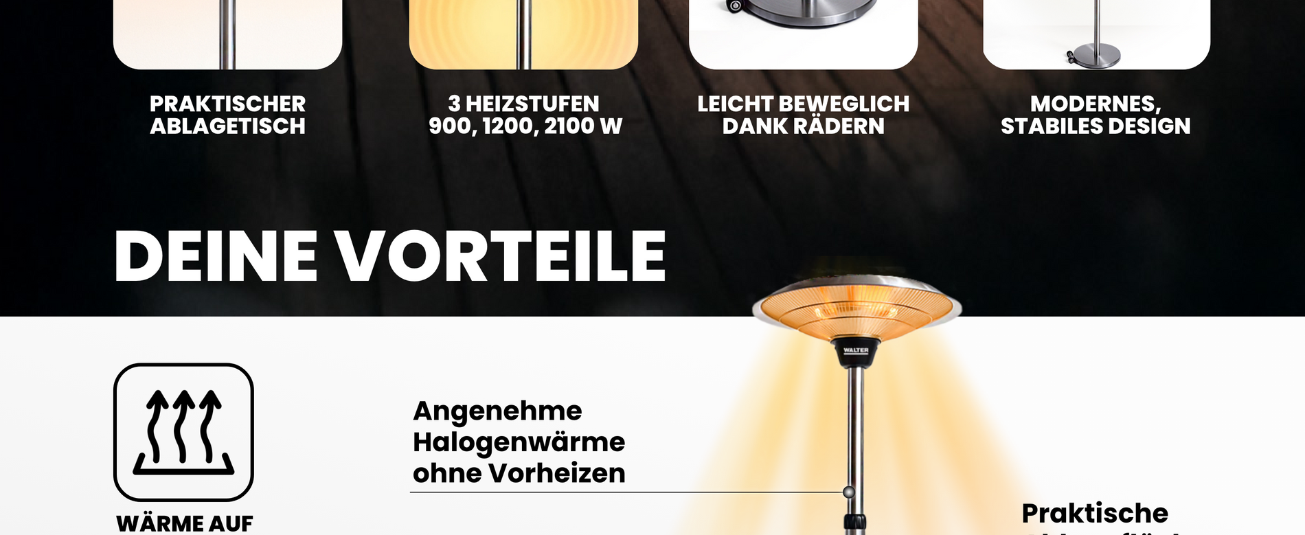 Der WALTER Halogen Terrassenstrahler mit drei Heizstufen und höhenverstellbarem Standfuß (180–210 cm) sorgt für angenehme Wärme im Freien – mit Ablagetisch, Rollen und IP44-Schutz ideal für Terrasse und Garten.