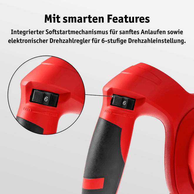• Elektronische Drehzahlregelung: Du passt die Geschwindigkeit präzise an das jeweilige Material an.