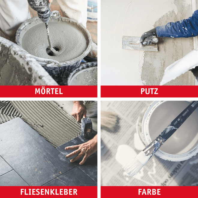 Der leistungsstarke 1400-Watt-Motor eignet sich ideal zum Mischen von Farben, Putz, Kleber und Mörtel – perfekt für Baustelle, Renovierung oder Werkstatt.