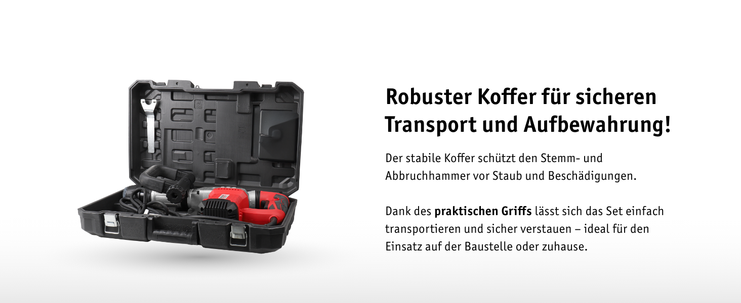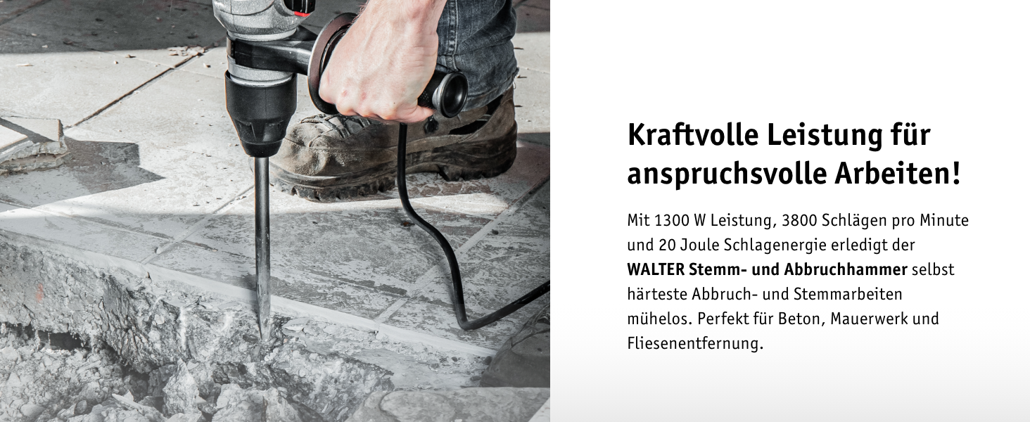 Der WALTER Stemm- und Abbruchhammer 1300 W mit 20 Joule Schlagenergie und 3800 Schlägen/Min ist ideal für Beton und Mauerwerk – SDS Max, 6 kg leicht, inkl. Meißel und Koffer für flexible Einsätze.