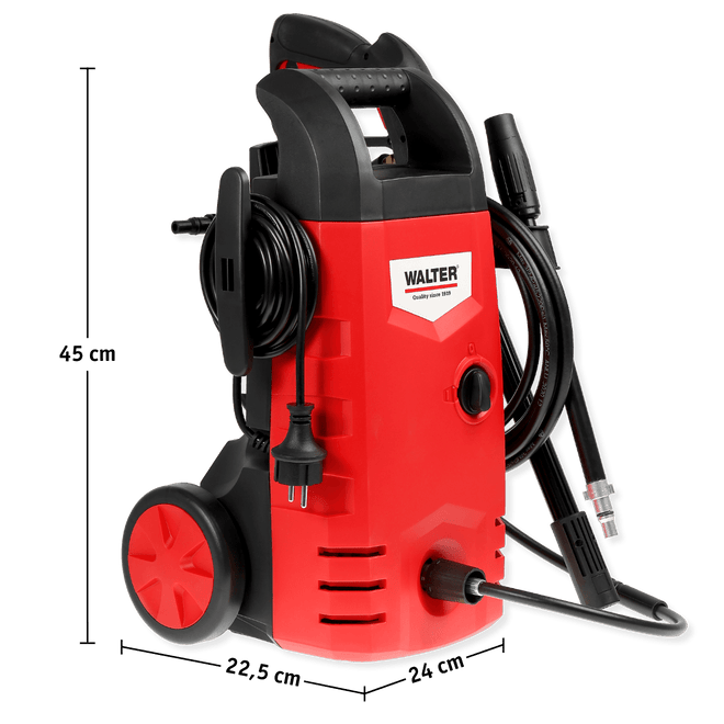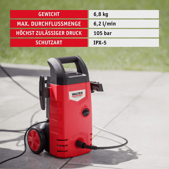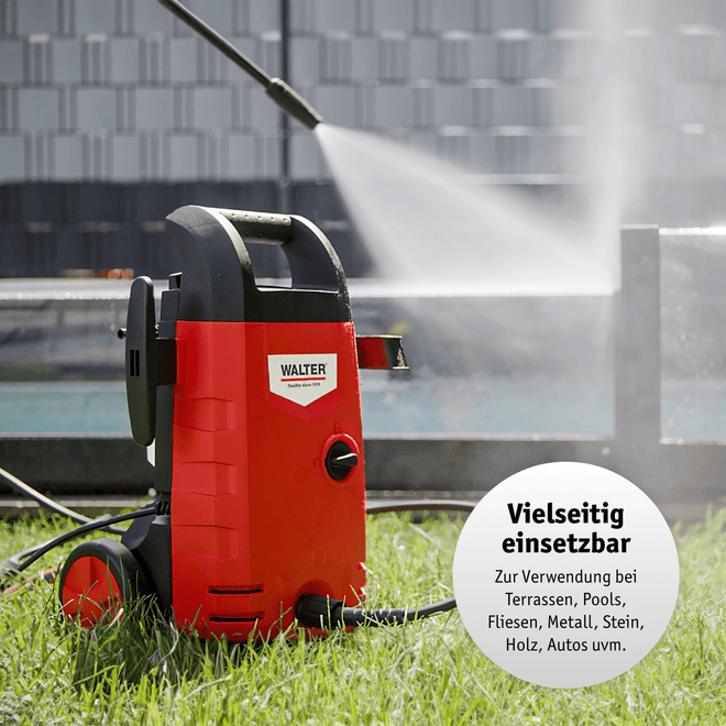 The compact WALTER high-pressure cleaner cleans vehicles, patios and more powerfully and safely – with an adjustable jet nozzle, quick-release bayonet lock, trigger lock and extensive accessories.