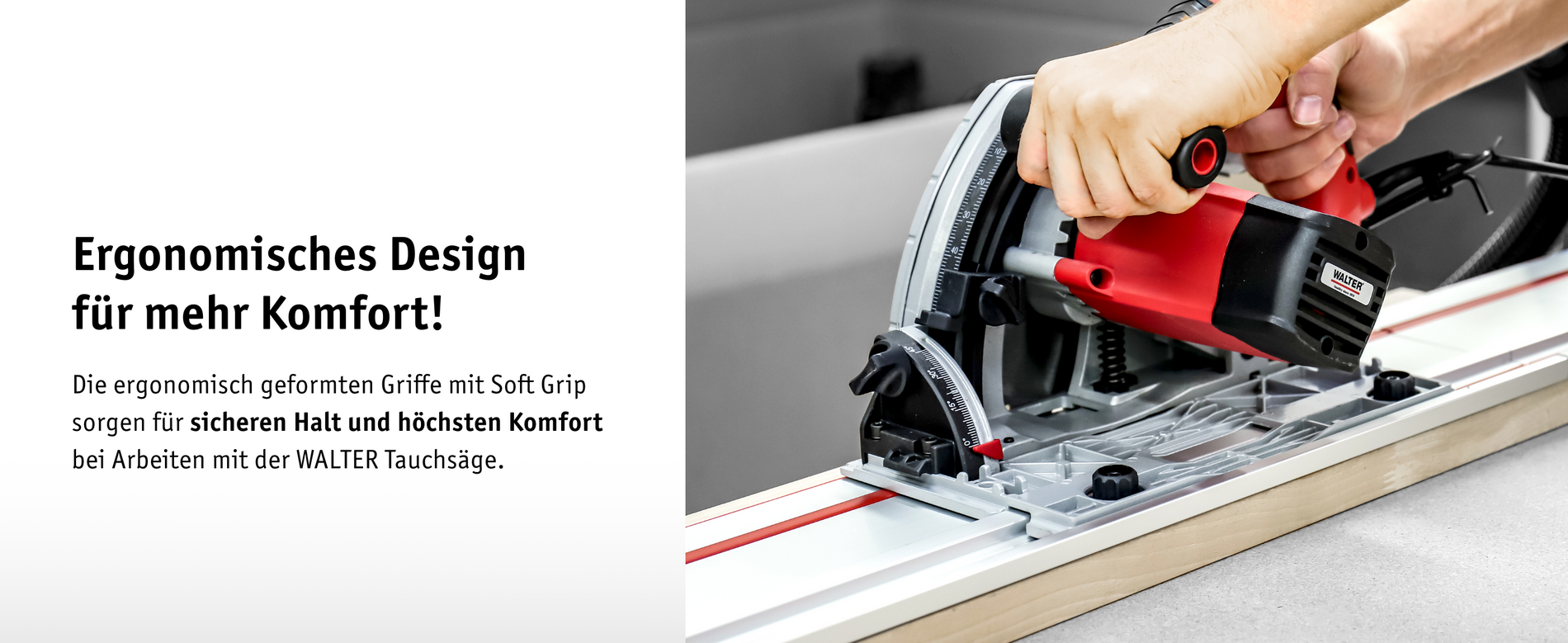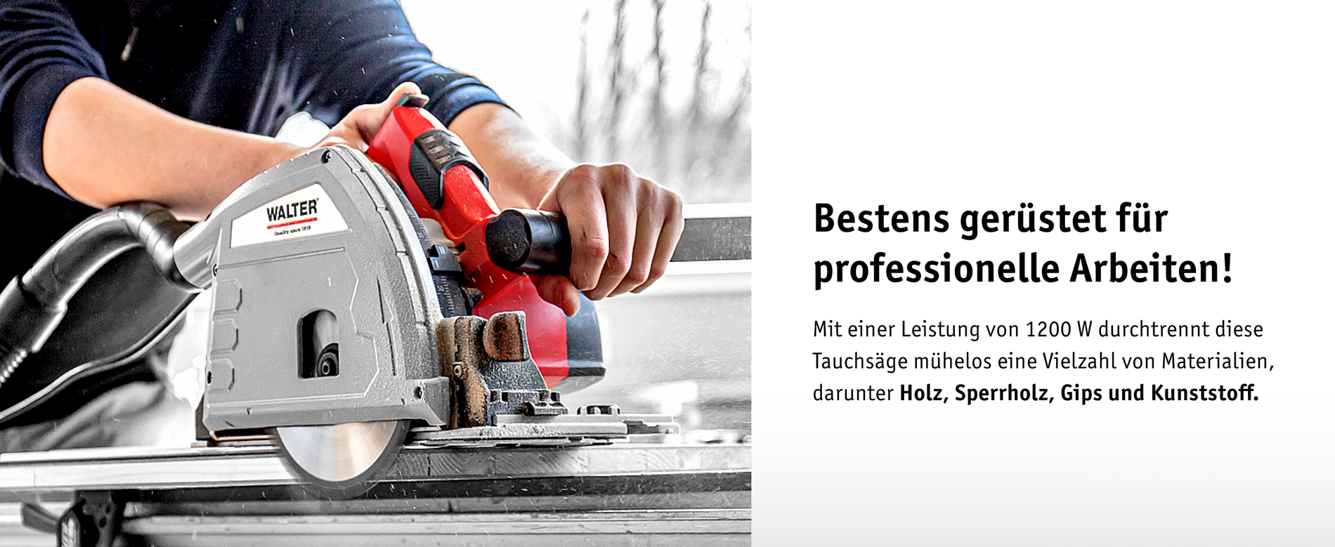 Die WALTER Tauchsäge 1200 W mit Führungsschienen überzeugt mit präziser Schnitttiefenverstellung, kraftvollem Motor und zwei Sägeblättern – ideal für exakte Zuschnitte in Haus und Garten.