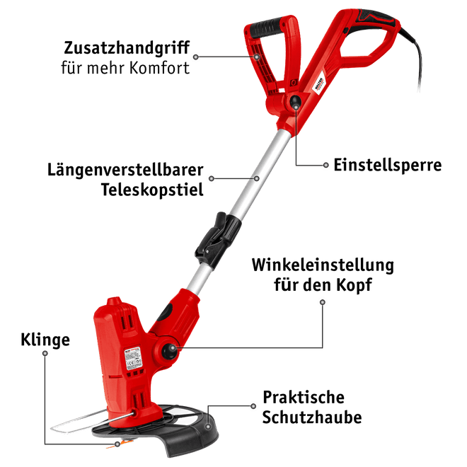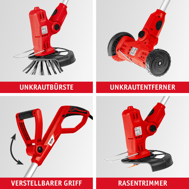 Der WALTER 3-in-1 Multitrimmer/Bürste 450 W vereint drei Geräte in Einem: Rasentrimmer, Fugenreiniger und Gehwegreiniger. Er trimmt mühelos Rasen, entfernt hartnäckiges Unkraut aus Fugen und reinigt zuverlässig Gehwege sowie Einfahrten.