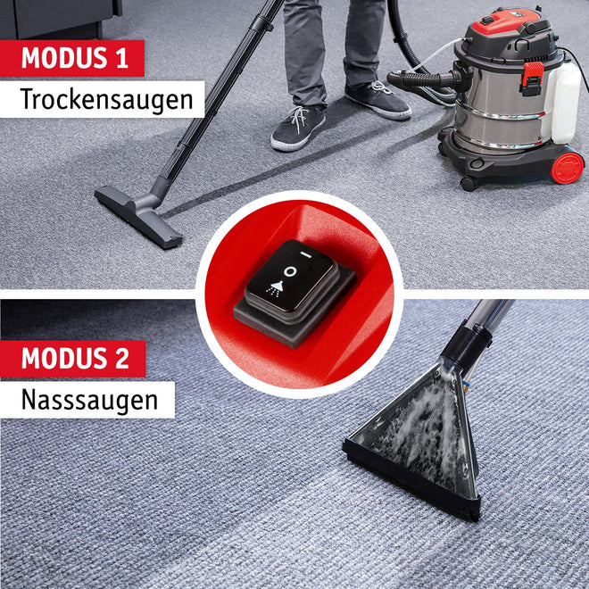 Anders als ein reiner Nasssauger kann der Waschsauger auch Reinigungsmittel auf die Oberfläche sprühen und gleichzeitig mit der Saugdüse das schmutzige Wasser absaugen. Das Ergebnis: saubere Teppichböden, Polster und Autositze.