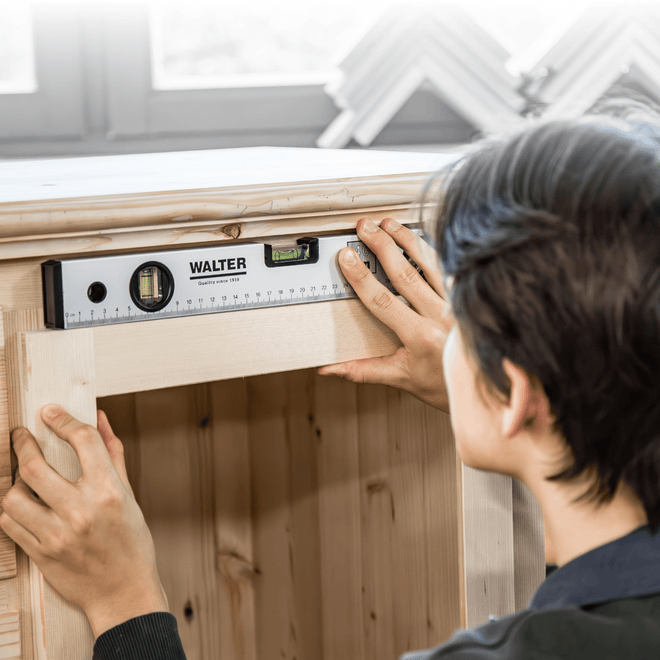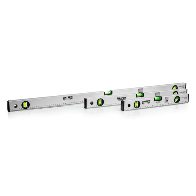 Das 3-teilige WALTER Wasserwaagen-Set mit 40, 60 und 100 cm Länge bietet präzise Messungen dank horizontaler und vertikaler Libellen – im robusten, leichten Aluminiumgehäuse für vielseitige Einsätze.