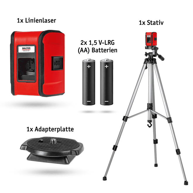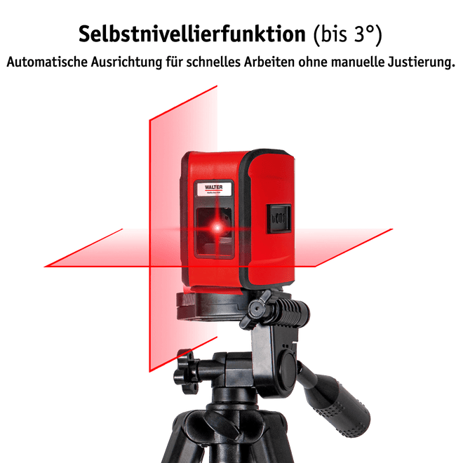 The WALTER cross line laser with automatic leveling in 6 seconds ensures precise alignment – including tripod (54–158 cm), LED status display and ±0.5 mm/m accuracy for precise construction and interior work.