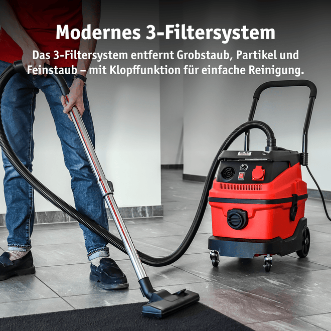 Der WALTER Multifunktionssauger 1600 W saugt trocken, nass und bläst – mit 18 kPa Saugkraft und Gerätesteckdose ideal für Werkstatt, Garage und Synchronbetrieb mit Elektrowerkzeugen.