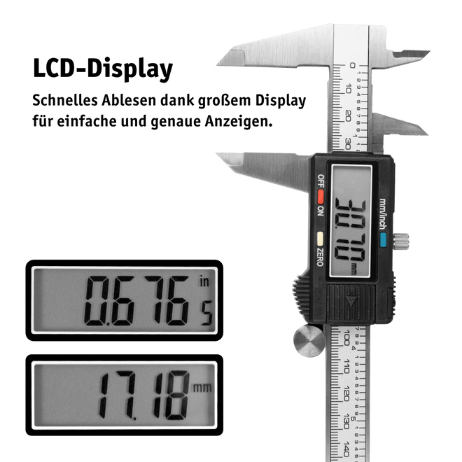 Die digitale Schiebelehre von WALTER misst präzise bis 150 mm mit 0,01 mm Auflösung – ideal für Außen-, Innen-, Stufen- und Tiefenmessungen. Mit LCD-Display, Feineinstellrad und Aufbewahrungsbox.