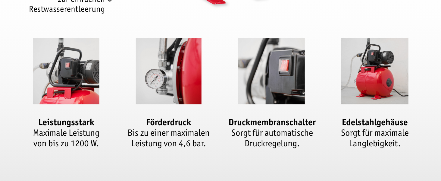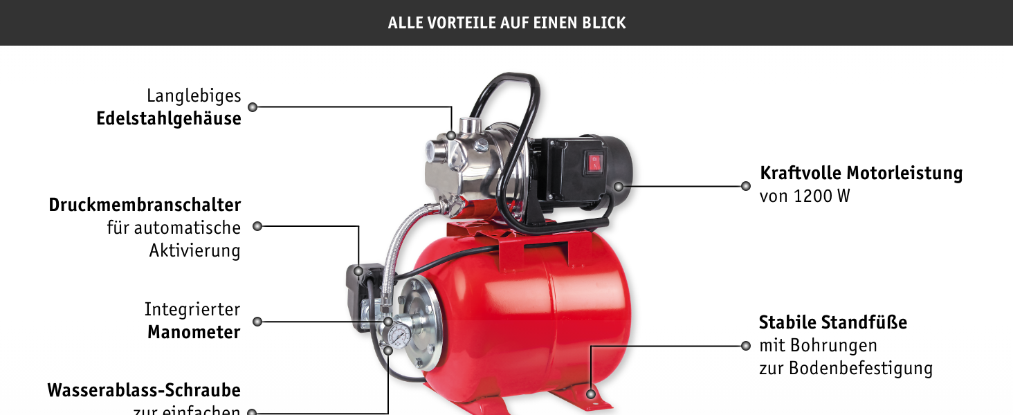 Das WALTER Hauswasserwerk 1200 W fördert Wasser aus Zisterne oder Brunnen bis 46 m Höhe – ideal für Garten und Haus. Mit Abschaltfunktion und Zubehör-Set für sichere, effiziente Versorgung.