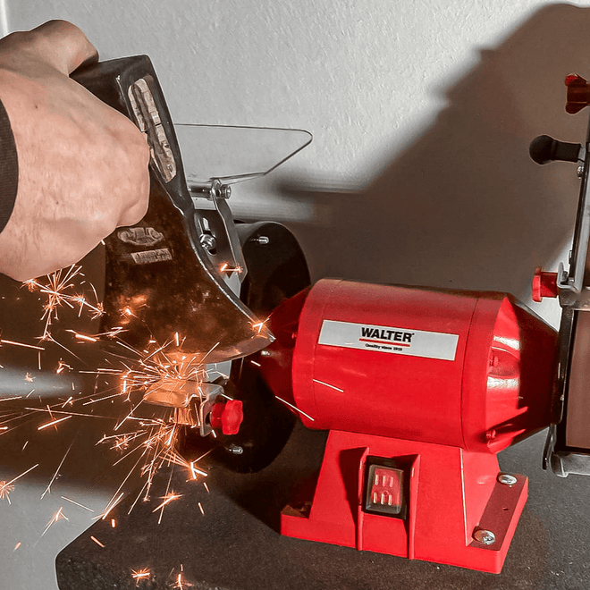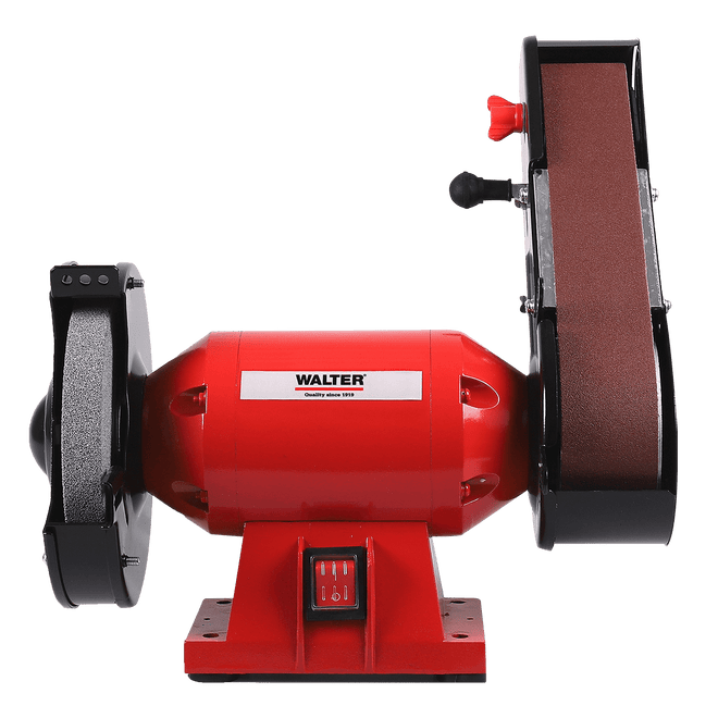 Der WALTER Kombischleifer 240 W vereint Schleifscheibe und Bandschleifer – ideal zum Schärfen, Schleifen und Polieren. Mit Funken-Schutz, Werkstückhalterung und robuster Fixierung für präzises Arbeiten.