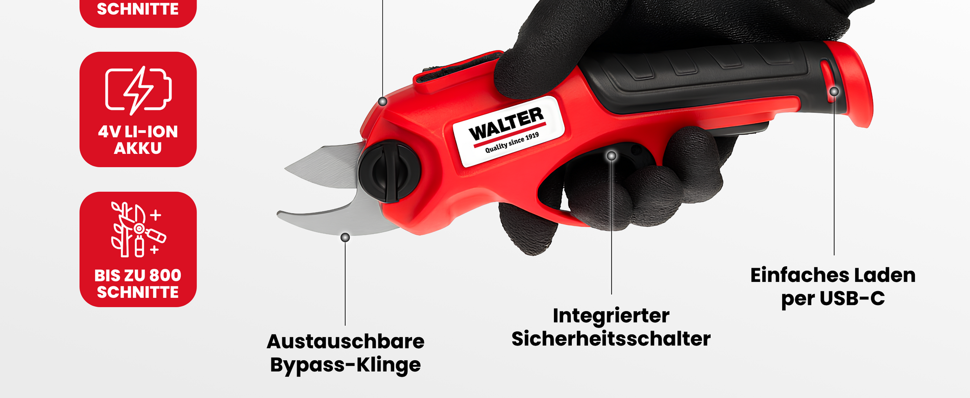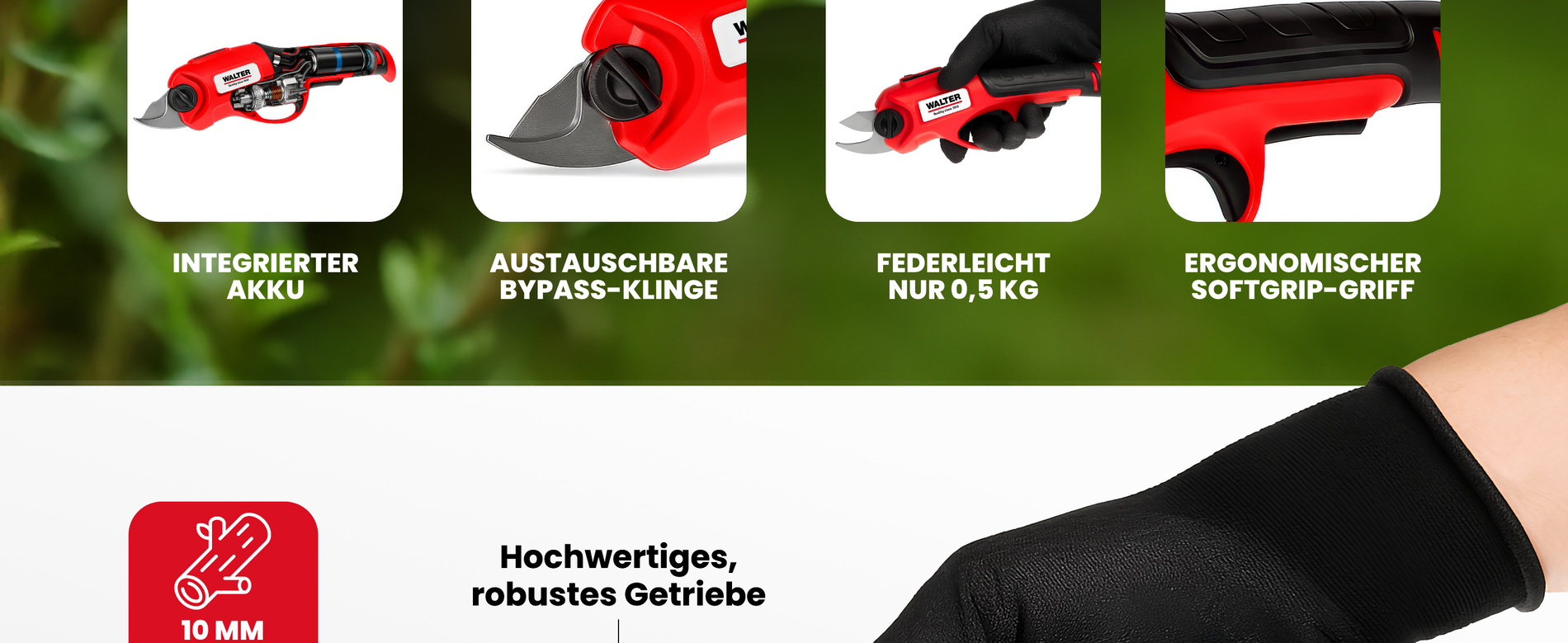 Die WALTER Li-Ion Akku-Astschere 4 V verbindet Kraft und Komfort für präzise Schnitte im Garten. Mit ihrem leistungsstarken 4V-Akku und der scharfen Bypass-Klinge schneidet sie mühelos Äste bis 10 mm – ganz ohne Kraftaufwand. Perfekt für Rosen, Sträucher und Ziergehölze – für gepflegte Pflanzen und gesunde Triebe.