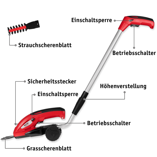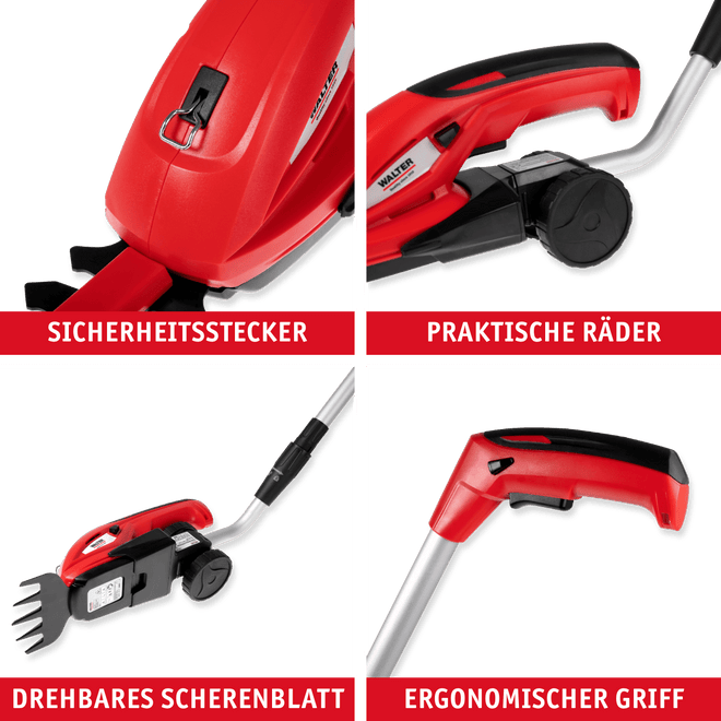 Die WALTER Akku Gras- und Strauchschere 7,2 V bietet kabellose Flexibilität für präzise Rasenkanten und Sträucher – mit Teleskopschlitten, LED-Ladestandsanzeige und zwei wechselbaren Schneidaufsätzen.