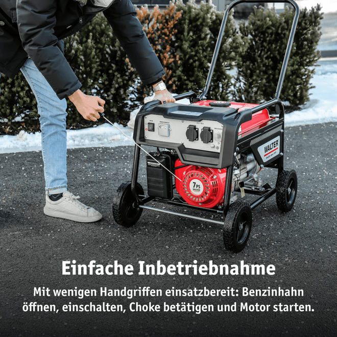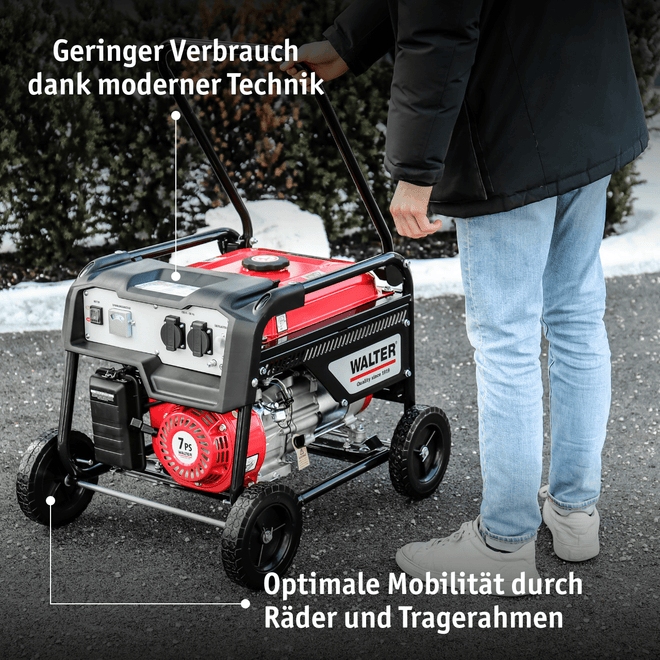 Der WALTER Stromerzeuger 2600 W liefert zuverlässige Energie mit bis zu 13,6 h Laufzeit – ideal für Baustelle, Garten und Camping. Mobil dank Klappgriff, Rädern und zwei Steckdosen.
