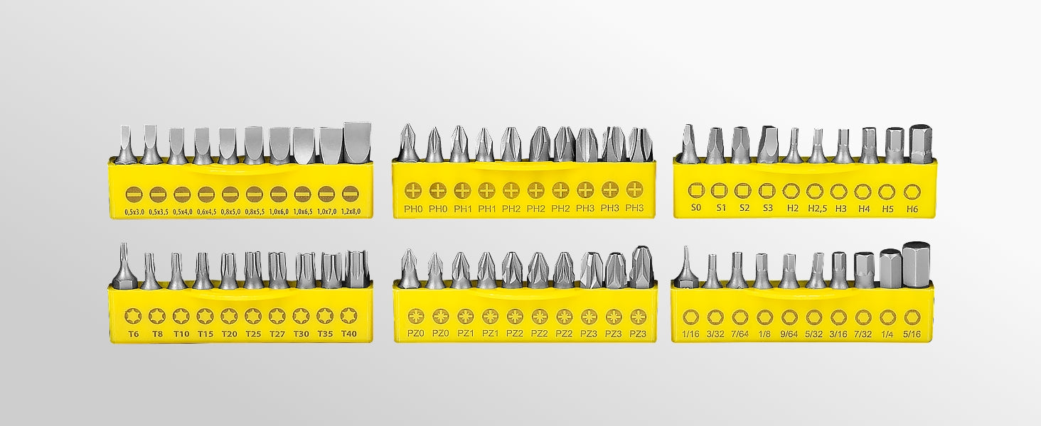 Schlitz Bits : 0,5 x 3,0 mm, 0,5 x 3,5 mm, 0,5 x 4,0 mm, 0,6 x 4,5 mm, 0,8 x 5,0 mm, 0,8 x 5,5 mm, 1,0 x 6,0 mm, 1,0 x 6,5 mm, 1,0 x 7,0 mm, 1,2 x 8,0 mm -